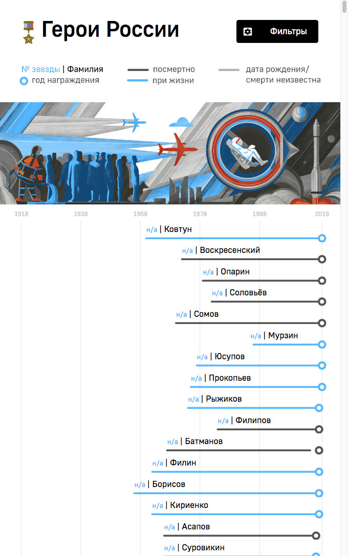 Интеактивная инфографика к Дню героев России. Содержит список всех удостоенных этого звания (кроме, разумеется, засекреченных). Иллюстрация Оксаны Марковой. Статья с инфографикой вживую тут.